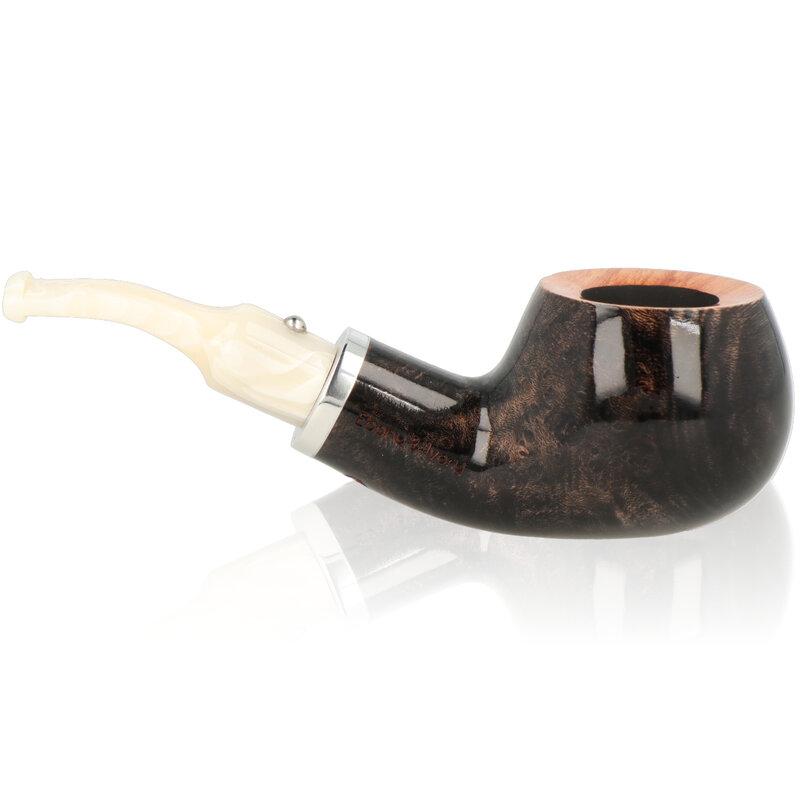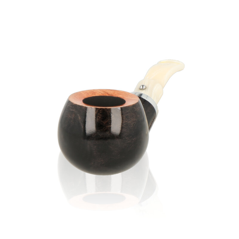 Ebony And Ivory Grey The Ebony and Ivory pipes are a short stem pipe perfect for chucking in a pocket when you are out and about. The quality of these is highly regarded, with luscious high gloss lacquers and tightly fitting fixtures. The Bowls have been given a light walnut stain before lacquering and are finished with a nickel band and white ivory look stems. German freehand artist Reiner Thilo has given his permission to resurrect his original design of the inlaid metal sphere on the stem which looks fantastic and really adds to the tactile feel of the pipes. The Number 2 is a thick-walled squat Apple shaped bowl with a tapered Ivory style stem.