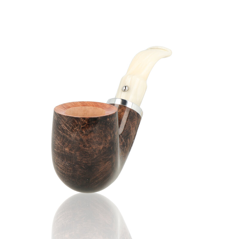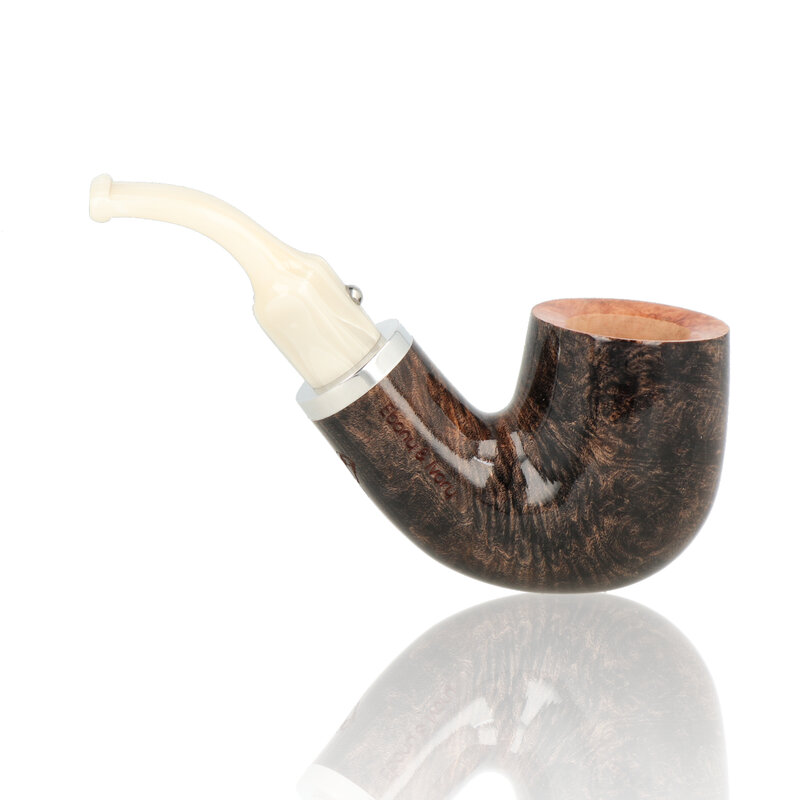 Ebony And Ivory Grey The Ebony and Ivory pipes are a short stem pipe perfect for chucking in a pocket when you are out and about. The quality of these is highly regarded, with luscious high gloss lacquers and tightly fitting fixtures. The Bowls have been given a light walnut stain before lacquering and are finished with a nickel band and white ivory look stems. German freehand artist Reiner Thilo has given his permission to resurrect his original design of the inlaid metal sphere on the stem which looks fantastic and really adds to the tactile feel of the pipes. The Number 4 is a classic deep-fill full bent billiard with a saddle stem.