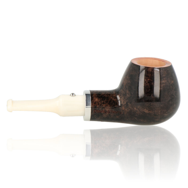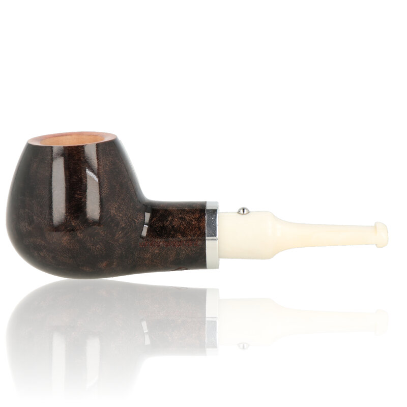 Ebony And Ivory Grey The Ebony and Ivory pipes are a short stem pipe perfect for chucking in a pocket when you are out and about. The quality of these is highly regarded, with luscious high gloss lacquers and tightly fitting fixtures. The Bowls have been given a light walnut stain before lacquering and are finished with a nickel band and white ivory look stems. German freehand artist Reiner Thilo has given his permission to resurrect his original design of the inlaid metal sphere on the stem which looks fantastic and really adds to the tactile feel of the pipes. The Number 5 is a classic straight Apple with a saddle stem.