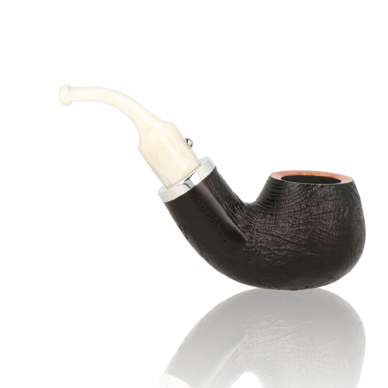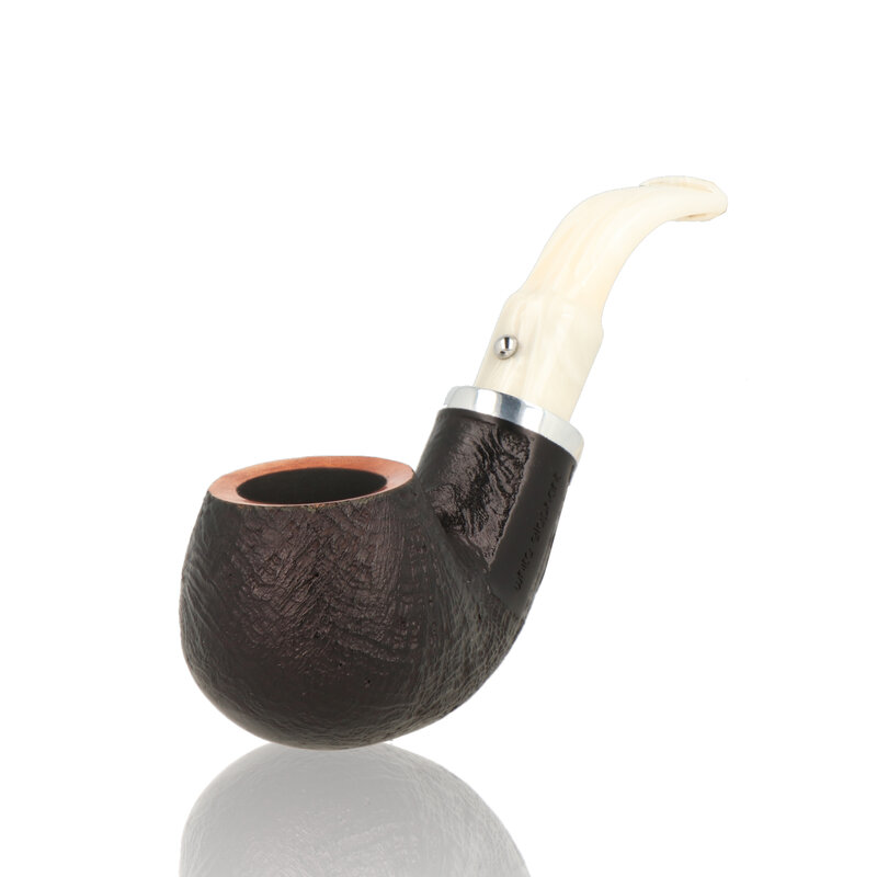 Ebony And Ivory Sandblast The Ebony and Ivory pipes are a short stem pipe perfect for chucking in a pocket when you are out and about. The quality of these is highly regarded, with luscious sandblasted bowls and tightly fitting fixtures. The Bowls have been given a wonderful black stain and are finished with a nickel band and white ivory look stems. German freehand artist Reiner Thilo has given his permission to resurrect his original design of the inlaid metal sphere on the stem which looks fantastic and really adds to the tactile feel of the pipes. The Number 1 is a classic full bent billiard with a tapered stem.