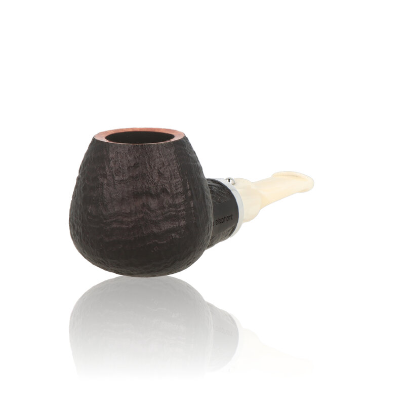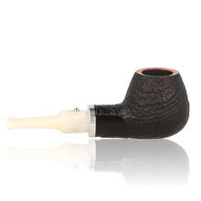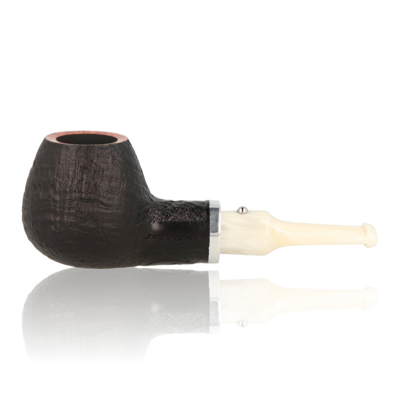 Ebony And Ivory Sandblast The Ebony and Ivory pipes are a short stem pipe perfect for chucking in a pocket when you are out and about. The quality of these is highly regarded, with luscious sandblasted bowls and tightly fitting fixtures. The Bowls have been given a wonderful black stain and are finished with a nickel band and white ivory look stems. German freehand artist Reiner Thilo has given his permission to resurrect his original design of the inlaid metal sphere on the stem which looks fantastic and really adds to the tactile feel of the pipes. The Number 5 is a classic straight Apple with a saddle stem.
