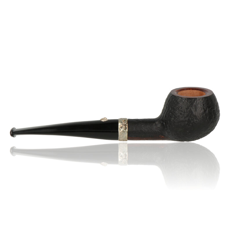 The Fossil sandblast finish gives the briar a rugged, tactile surface, contrasted by a smooth rim and a polished metal band for a refined accent. The straight configuration offers a balanced feel in hand, while the classic apple bowl provides a comfortable, familiar smoking experience.