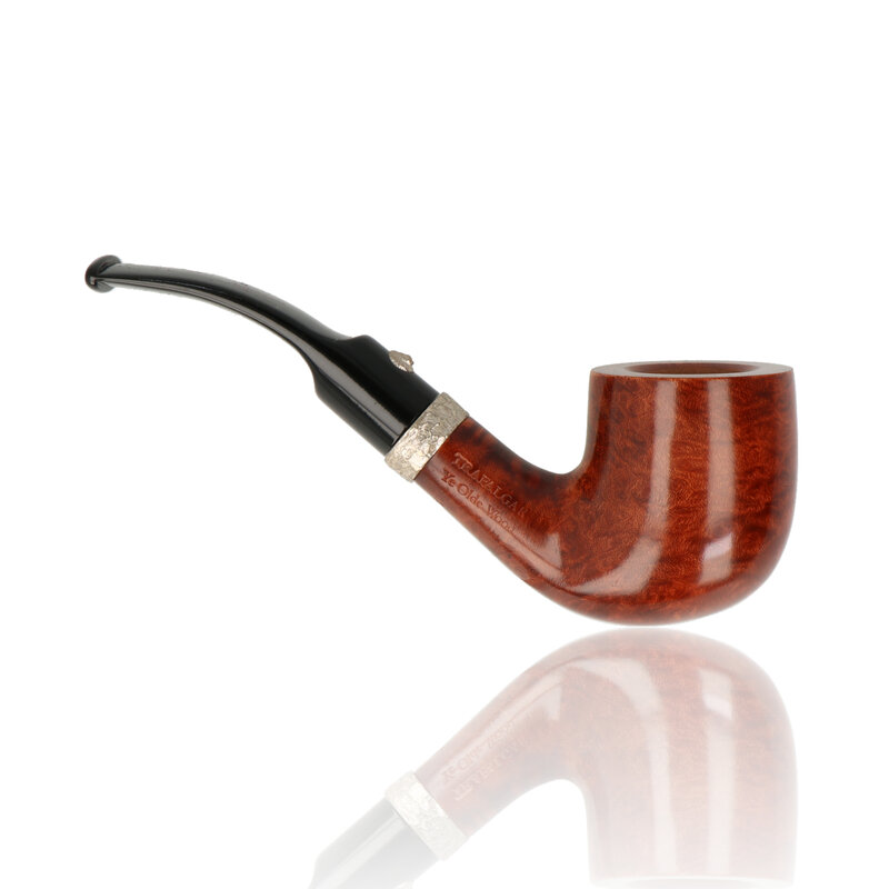 The Barling Trafalgar Ye Olde Wood 1823 is a straight briar pipe with a gently curved stem, made from aged briar and finished with a polished stain and decorative metal band.