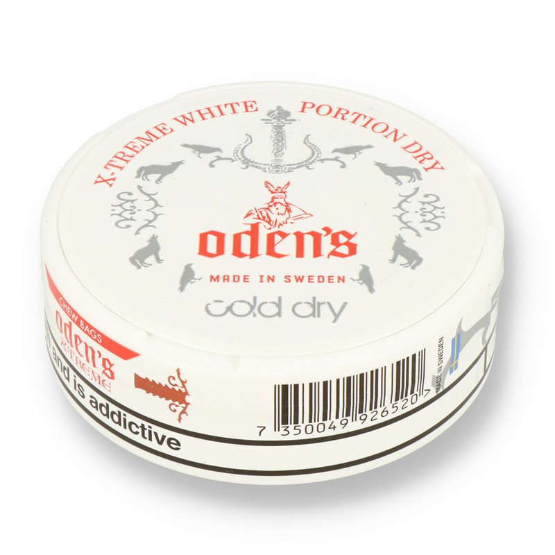Oden's X-treme White Cold Dry Powerful but well rounded and flavourful chewing tobacco blend with clear and cooling flavours of real mint oils. Extremely strong nicotine experience in unmoistened chewing portion bags. The tub contains a handy compartment in the top to discard of your used bags.