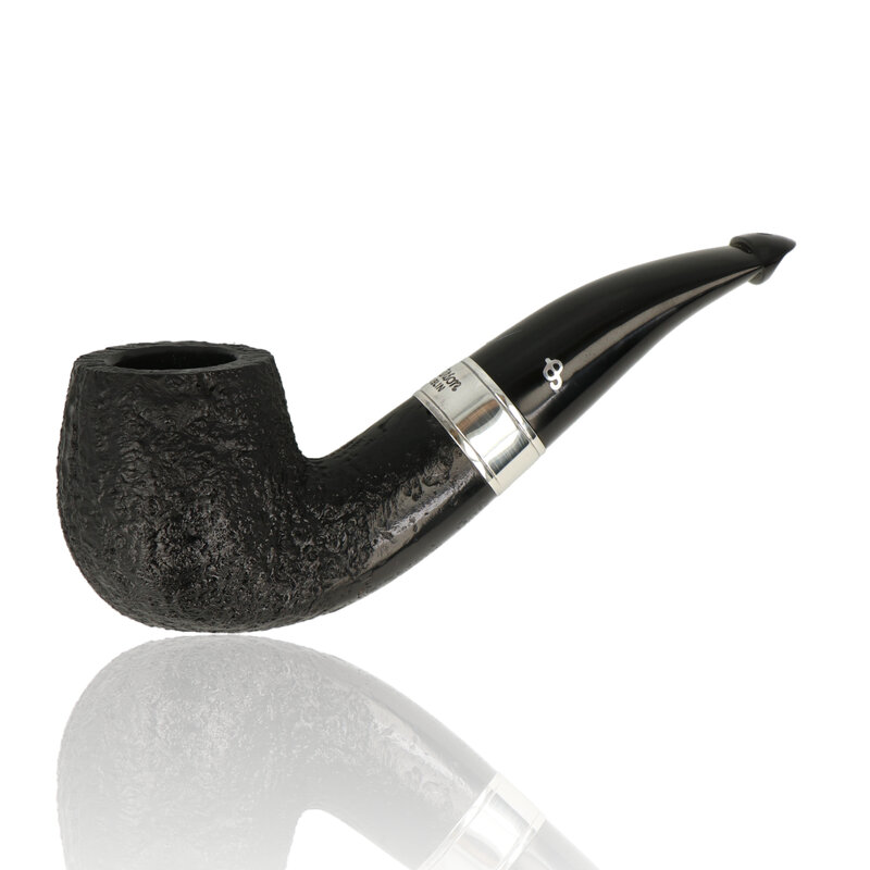 This model features a sandblasted briar finish, silver band, and vulcanite stem, combining durability with refined styling.