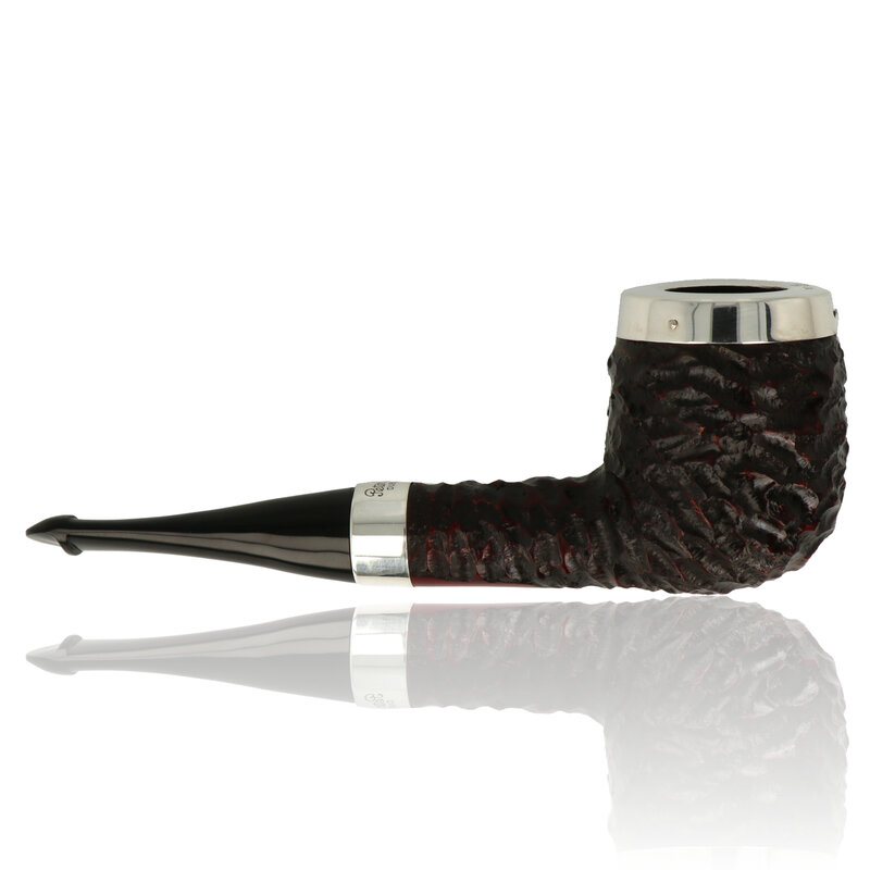 The pipe is fitted with a sterling silver rim cap and matching band, adding durability while enhancing its classic appearance. The vulcanite P-Lip stem directs smoke upward for a smoother draw.